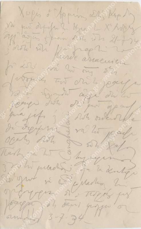 Έλαβον την κάρταν σου και σε ευχαριστώ πολύ. Είμεθα όλοι καλά και σας ασπαζώμεθα. Την γιαγιάκαν μου αρκούντως να την στείλετε, εγώ δεν ειμπορώ, όλοι δεν μείνω χαρά την γιαγιάκαν μου.