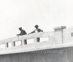 Δυο άνδρες στηριγμένοι στο στηθαίο της γέφυρας. Ο ένας κοιτάζει προς την κατεύθυνση του φακού