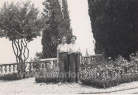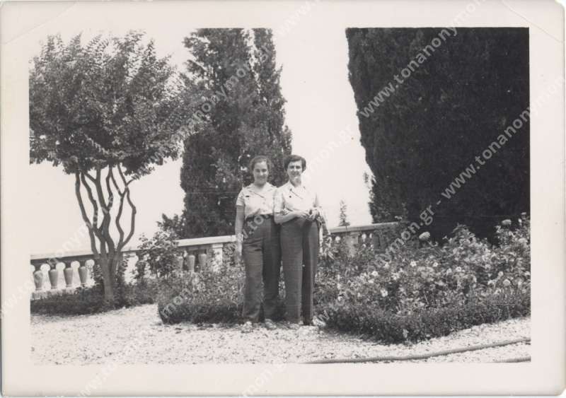 Δυο γυναίκες ποζάρουν σε εξωτερικό χώρο που θυμίζει Αχίλλειον, στην Κέρκυρα