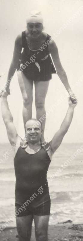 Ο Δημήτρης Γεωργόπουλος με την Αγλαϊα στους ώμους του, σε μια επίδειξη ακροβατικών στην παραλία