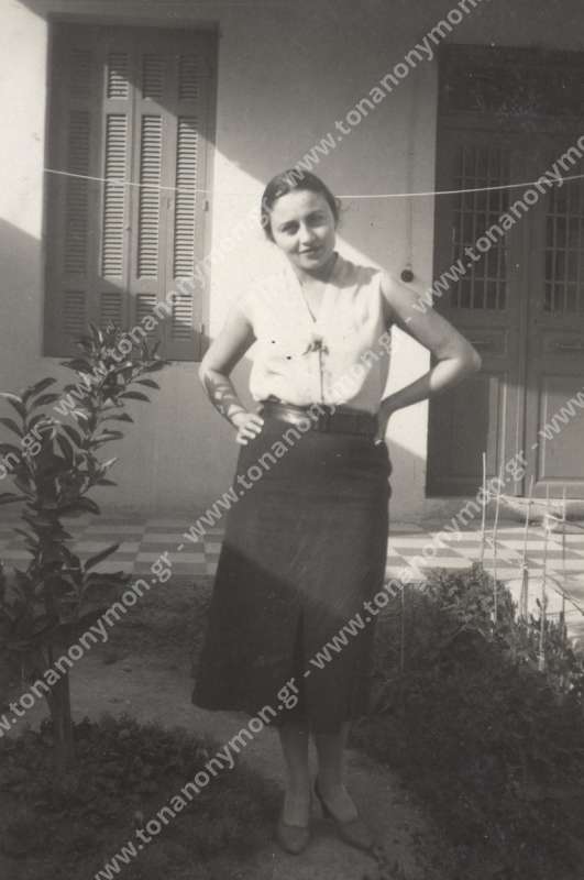 Η Αγλαϊα Γεωργοπούλου στο πατρικό της στην Αθήνα, κάτω από την προσωπογραφία που της είχε φτιάξει ο Σπ. Βασιλείου με τον οποίο ήταν συμφοιτητές στην Ανωτάτη Σχολή Καλών Τεχνών