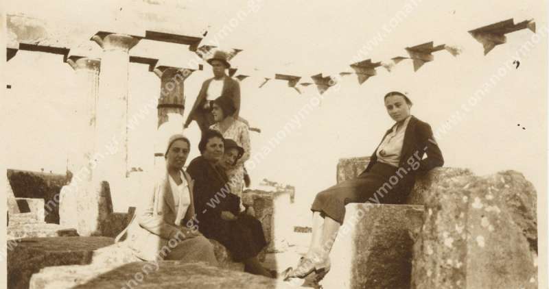 Η Αγλαϊα Γεωργοπούλου ξεκουράζεται σε χώρο που θυμίζει αρχαίο οικοδήμημα. Απέναντί της μια ομάδα άγνωστων ανθρώπων.Στο βάθος δεξιά, όρθιος, φορώντας καπέλο, ο Δημήτρης Γεωργόπουλος.