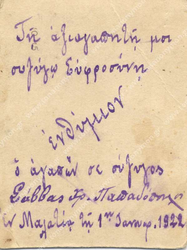Στην μπροστινή πλευρά "Ο πατέρα μου Μαλάτια 1922", γραμμένο από την Παλμύρα Παπαδοπούλου. Στην πίσω όψη: "Τη αγαπητή μου συζύγω Ευφροσύνη ενθύμιον. Ο αγαπών σε σύζυγος Σάββας Χρ. Παπαδόπουλος εν Μαλατία τη 1η Ιανουαρίου 1922"