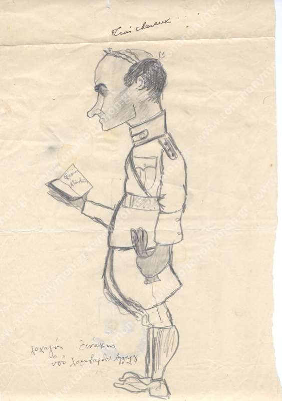 Σκίτσο του στρατιώτη Δημήτρη Γεωργόπουλου (Δ.Σ.Γ: Δημήτρης Σταύρου Γεωργόπουλος) και κάτω ακριβώς σημειωμένο το όνομα του Άγγελου Λομβάρδου προφανώς ως σκιτσογράφου