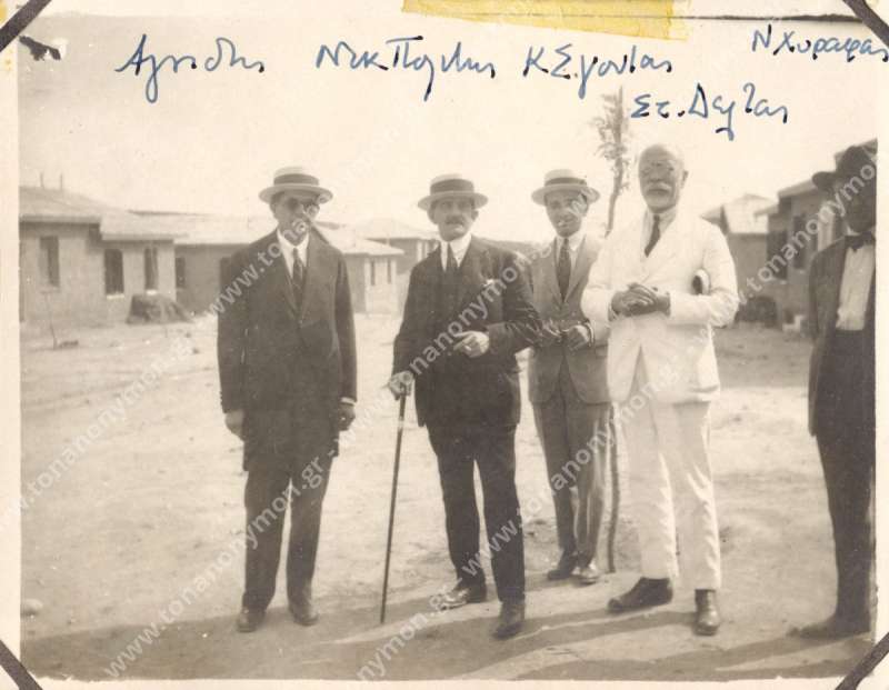 Οι Αγνίδης, Νίκος Πολίτης, Κώστας Σγούτας, Στέφανος Δέλτας και Νίκος Χωραφάς στον προσφυγικό συνοικισμό της Νέας Ιωνίας το 1924.