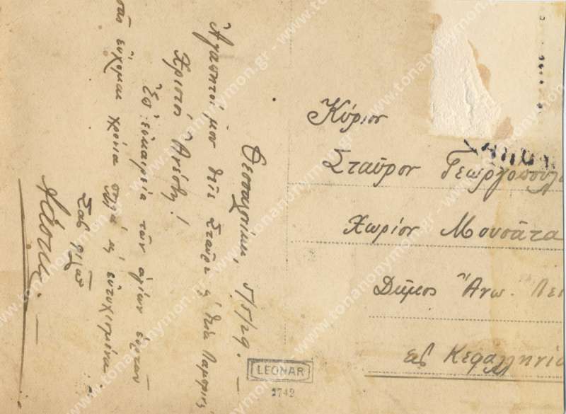 Αντίγραφο της φωτογραφίας με κωδ. 004-0011. Η χρονολογία 1929 είναι η χρονολογία κατά την οποία εστάλη η κάρτα, πιθανόν όμως να μην προσδιορίζει τη χρονολογία της ίδιας της φωτογραφίας.