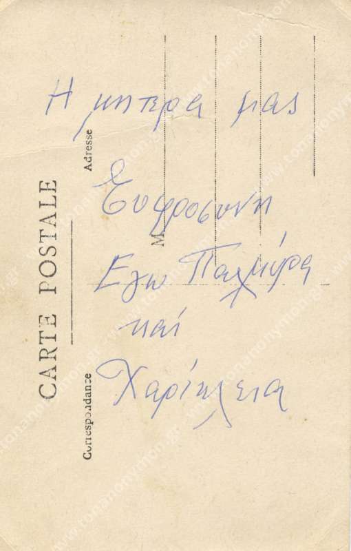 Έλαβον την κάρταν σου και σε ευχαριστώ πολύ. Είμεθα όλοι καλά και σας ασπαζώμεθα. Την γιαγιάκαν μου αρκούντως να την στείλετε, εγώ δεν ειμπορώ, όλοι δεν μείνω χαρά την γιαγιάκαν μου.