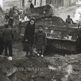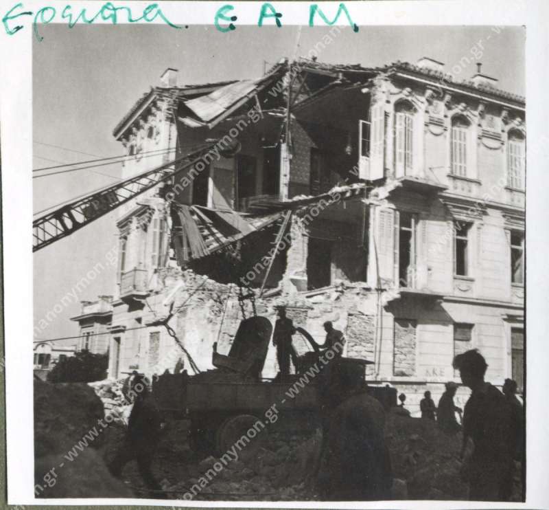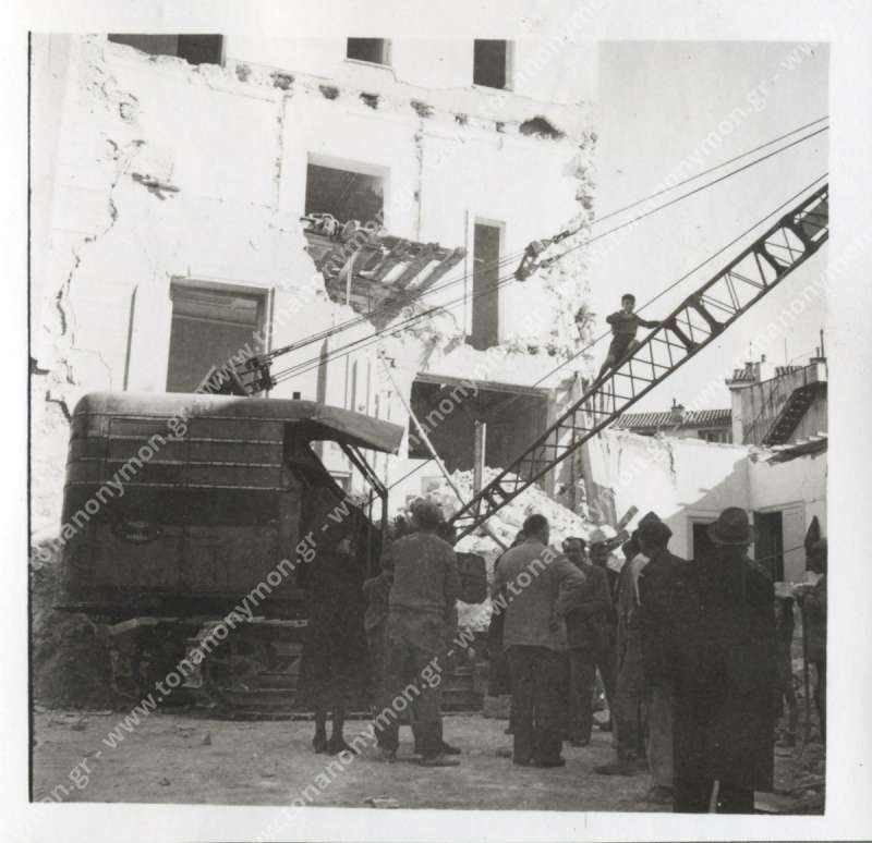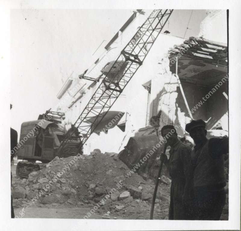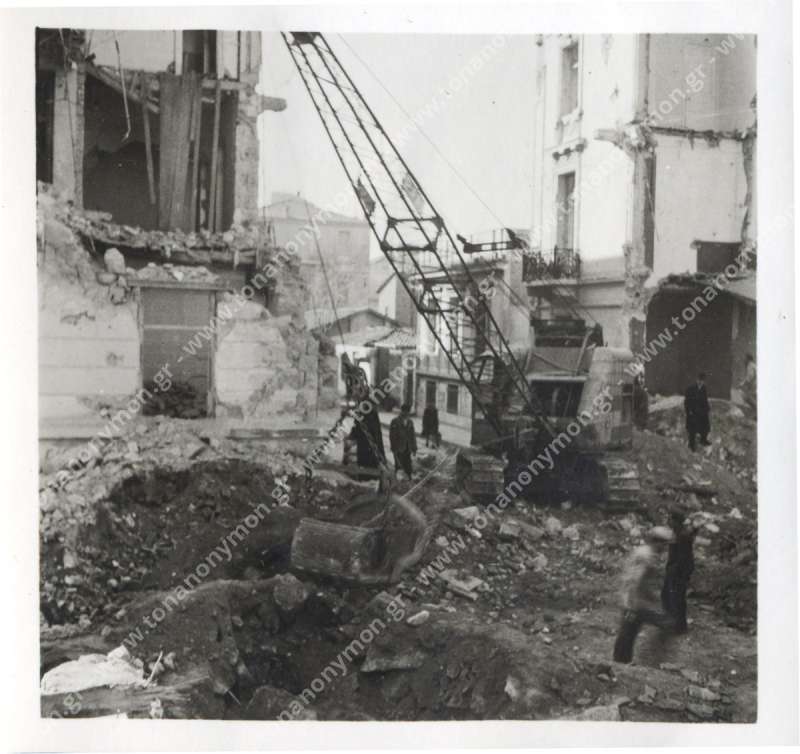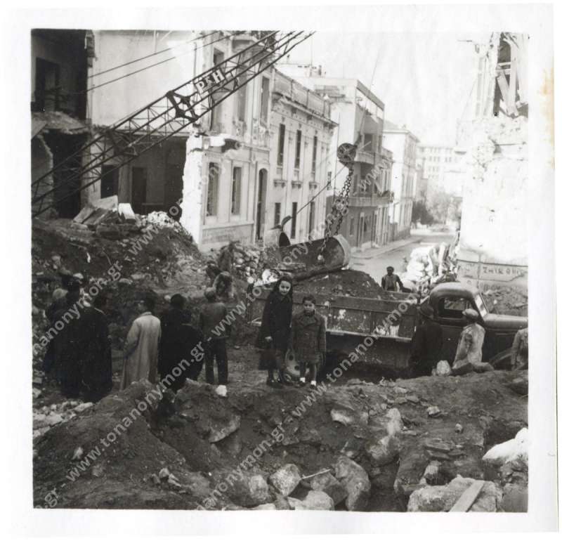Κόσμος παρακολουθεί την κατεδάφιση ενός κτιρίου. Δύο παιδιά, η Ναυσικά Γεωργοπούλου και ο αδελφός της Σταύρος, κοιτάζουν προς τον φακό.