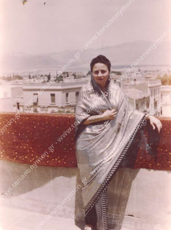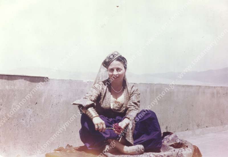 Η Αγλαϊα Γεωργοπούλου ποζάρει στην ταράτσα του σπιτιού της οικογένειας στην Πατησίων, φορώντας παραδοσιακή στολή