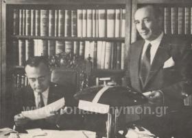 Ο Γεώργιος Μαύρος καθιστός στο γραφείο του. Δίπλα του, στέκεται όρθιος ο Κώστας Στεφανουδάκης.