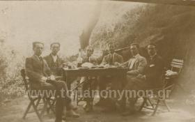 Μια παρέα έξι ανδρών καθισμένη γύρω από ένα τραπέζι σε εξοχική τοποθεσία