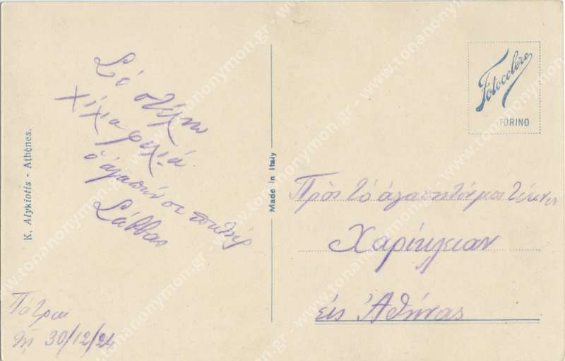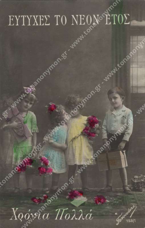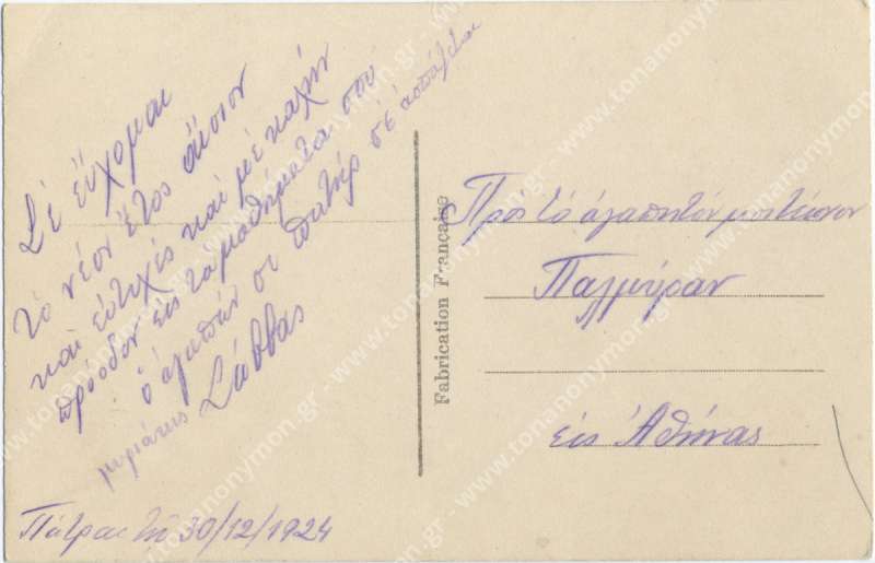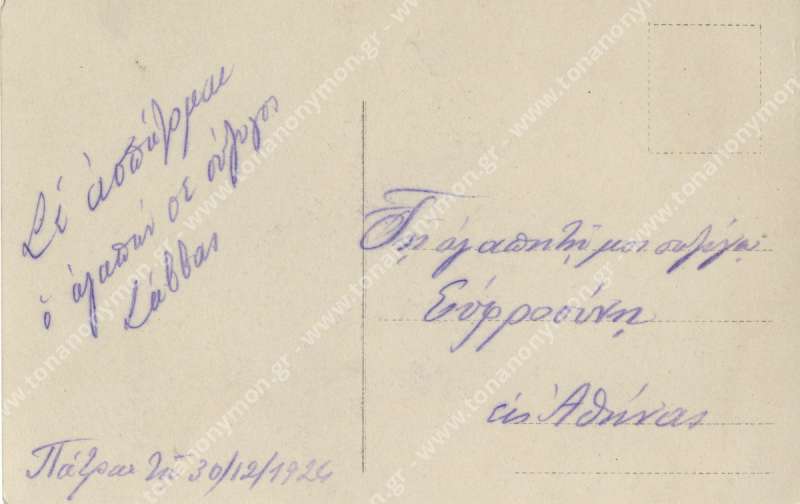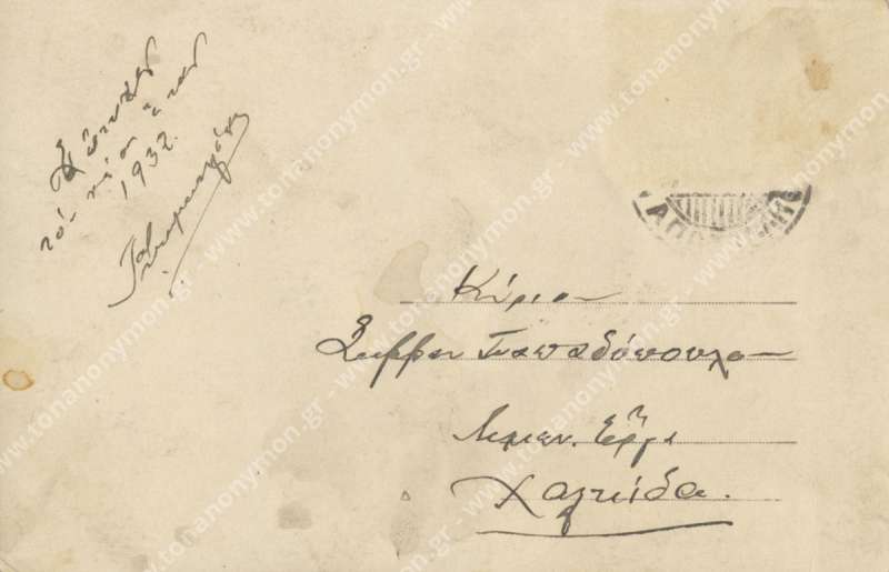 "Ευτυχές το Νέον Έτος 1932 [......] Κύριον Σάββαν Παπαδόπουλον Λιμενικά Έργα Χαλκίδα", στην πίσω πλευρά