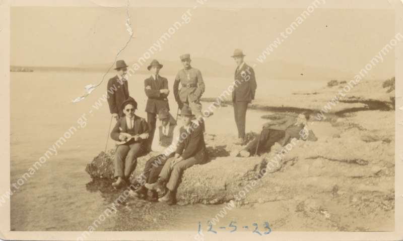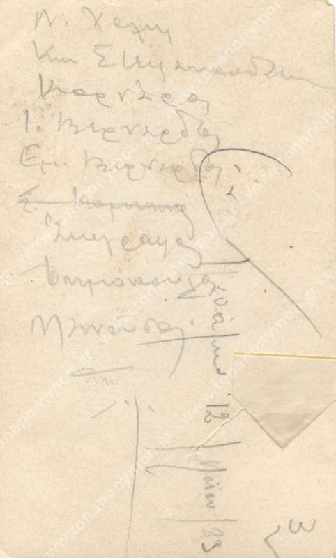 "Ν. Χελης, Κωνστ. Στεφανουδάκης, Καρνάρας, Ι. Βερνάρδος, Εμ. Βερνάρδος, Ζωγράφος, Δημόπουλος, Μανούσος. Εν Περάμω 12/ Μαϊου 1923"
