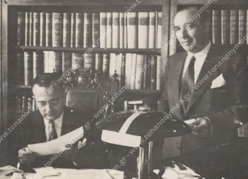 Ο Γεώργιος Μαύρος καθιστός στο γραφείο του. Δίπλα του, στέκεται όρθιος ο Κώστας Στεφανουδάκης.