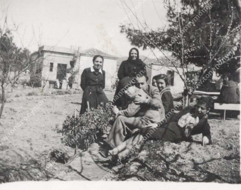 Μια παρέα ανδρών και γυναικών. Διακρίνεται η Παλμύρα Παπαδοπούλου (αριστερά) και ο Κώστας Στεφανουδάκης, που κρύβεται πίσω από τον ώμο άγνωστου άνδρα. Δεσπόζει η φυσιογνωμία της ηλικιωμένης που χαμογελάει.