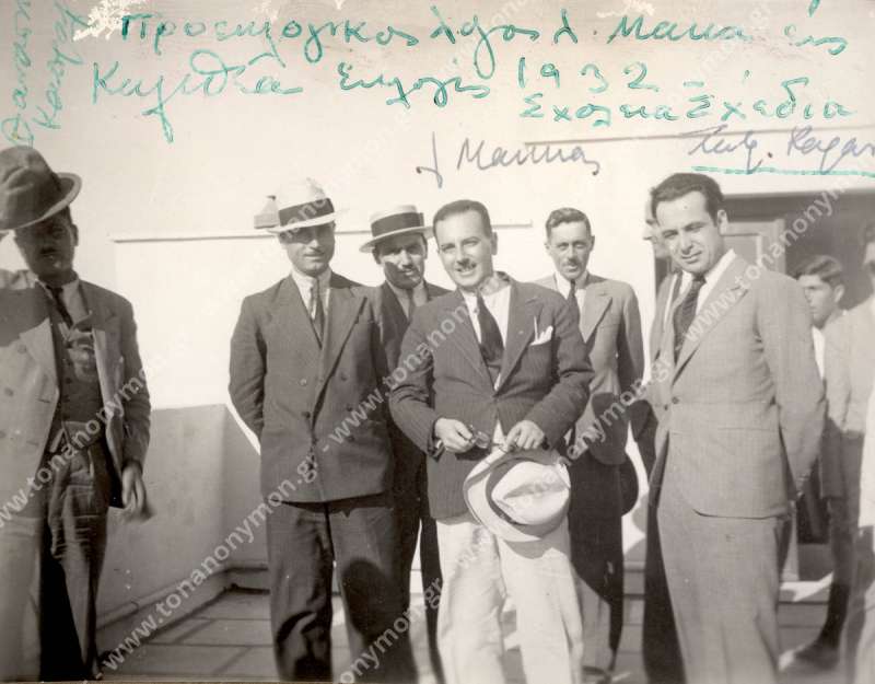 Ο Λέων Μάκκας στο κέντρο της φωτογραφίας με το λευκό καπέλο στα χέρια κατά τη διάρκεια προεκλογικής εκστρατείας στην Καλλιθέα το 1932. Αριστερά, ο Θανάσης Καπράλος και δεξιά ο Πάτροκλος Καραντινός.