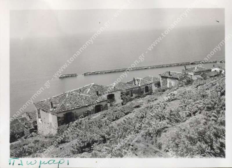 Το Πλωμάρι φωτογραφημένο από ψηλά προς την κατεύθυνση της θάλασσας έτσι, ώστε να φαίνεται η κατάσταση του λιμενοβραχίονα