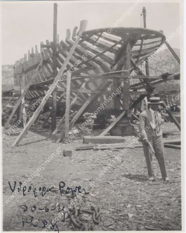 Ένας άνδρας με κοστούμι και καπέλο μπροστά σε υπό κατασκευήν πλοίο