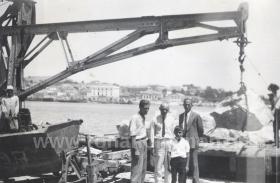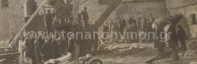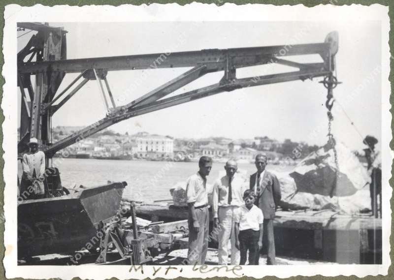 Δύο ενήλικες μαζί με ένα παιδί ποζάρουν μέσα από μια ατμομηχανή. Άλλοι στέκονται πίσω της. Στο βάθος διακρίνεται η Τράπεζα Ελλάδος της Μυτιλήνης
