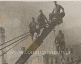 Ενήλικες άνδρες που έχουν μαζί τους και ένα παιδί ποζάρουν κάτω από έναν γερανό, όπως σηκώνει μια μεγάλη πέτρα.