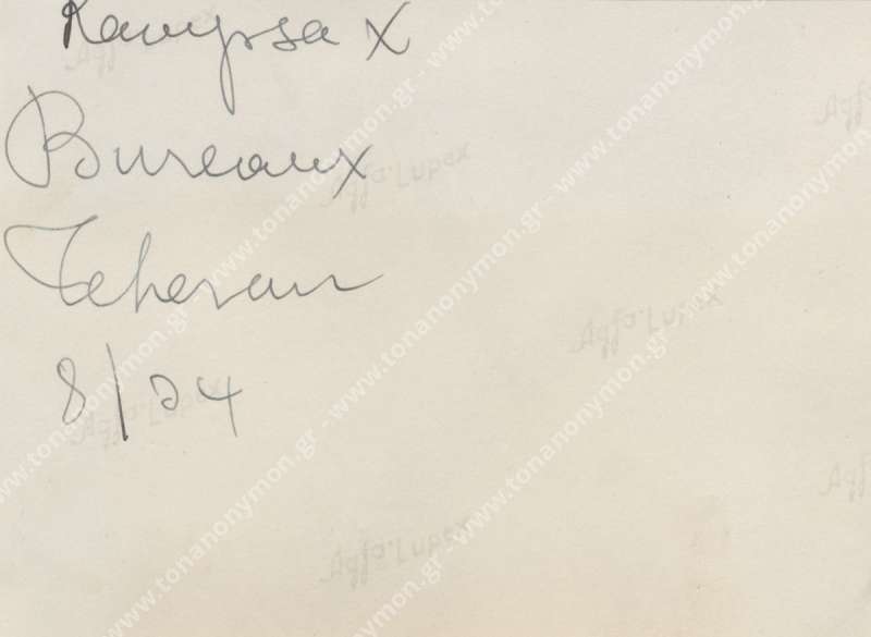 Ένα αυτοκίνητο δίπλα στο οποίο στέκεται ένας άνδρας ένστολος σταματημένο μπροστά σε σήραγγα. σύμφωνα με την εγγραφή στο πίσω μέρος πρόκειται για σημείο στη διαδρομή από Τεχεράνη προς την Κασπία στο πέρασμα του Firuzkuh (στην οροσειρά Albroz).