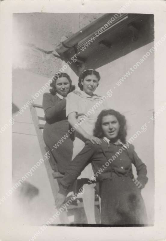 Τρεις νεαρές κοπέλες κοιτάζουν στο φακό. Οι δυο έχουν ανέβει στα σκαλιά μιας φορητής ξύλινης σκάλας.