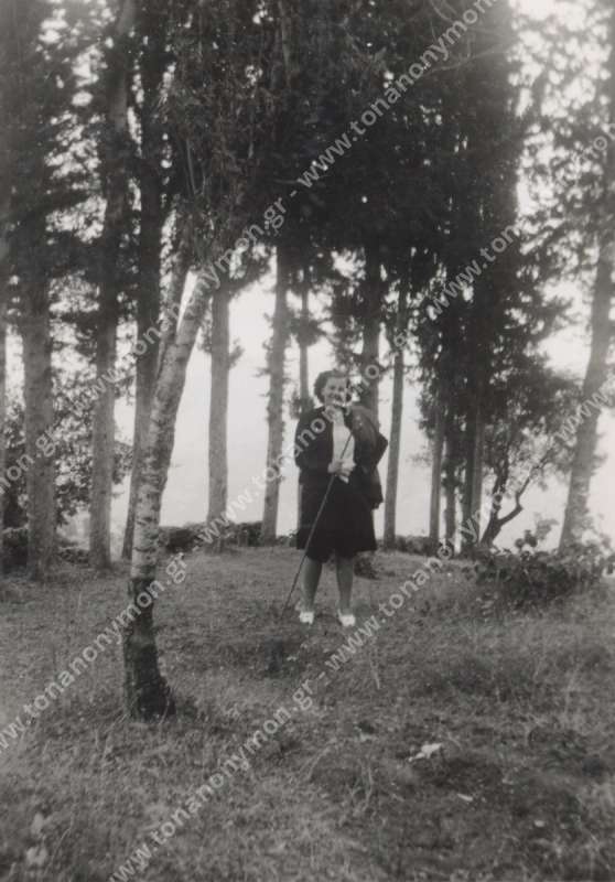 Μια γυναίκα μέσα σε δαδώση έκταση κρατώντας στα χέρια της ένα ραβδί, προφανώς για να τη βοηθάει στο βάδισμα