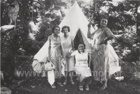 Η Παλμύρα Παπαδοπούλου μαζί με τρεις άλλες γυναίκες μπροστά στην είσοδο μιας σκηνής
