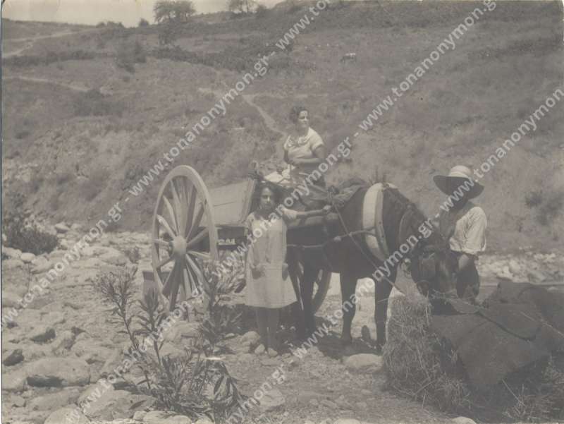 Μια άμαξα εν στάσει. Το άλογο τρώει. Πάνω στην άμαξα μια γυναίκα ( η κα. Ρωμαϊδου). Δίπλα στο άλογο η Παλμύρα Παπαδοπούλου και ο "οδηγός".