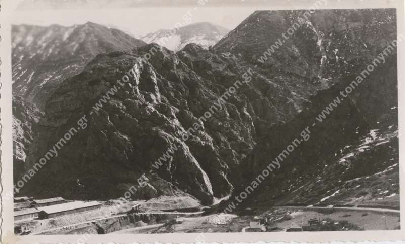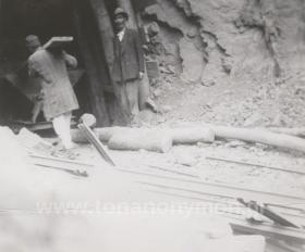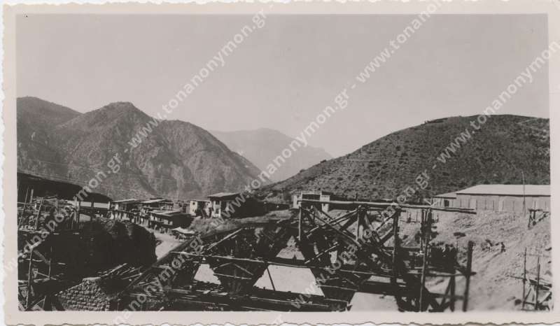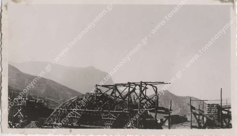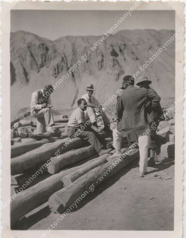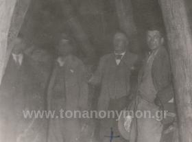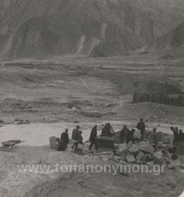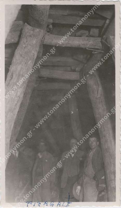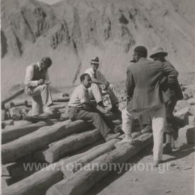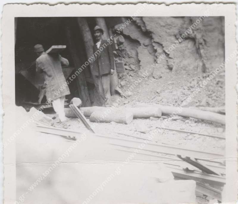 Εργάτες σε είσοδο γαλαρίας. Ο ένας με γυρισμένη την πλάτη στο φακό μεταφέρει στους ώμους του μία τάβλα. Ο άλλος κοιτάζει προς το φωτογράφο.