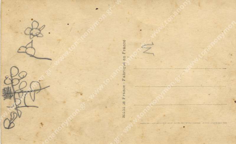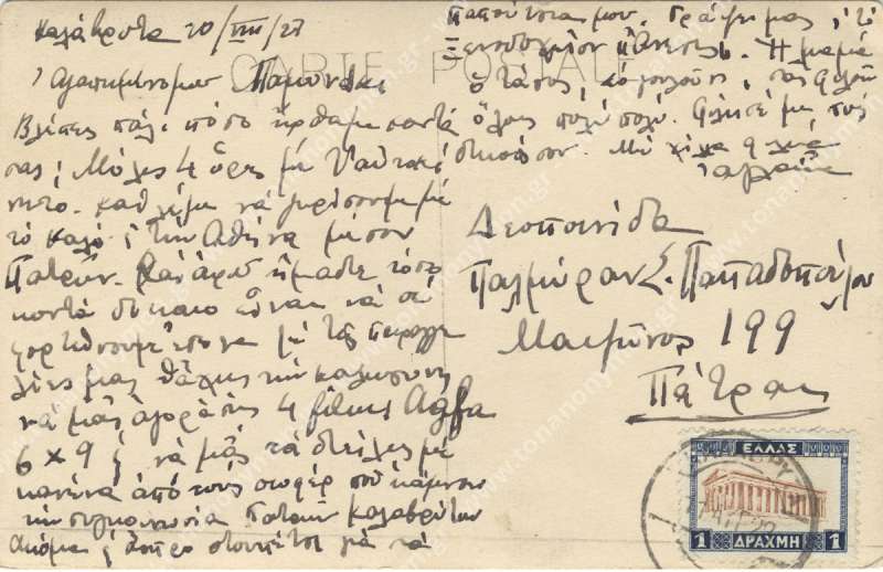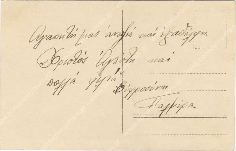 Έλαβον την κάρταν σου και σε ευχαριστώ πολύ. Είμεθα όλοι καλά και σας ασπαζώμεθα. Την γιαγιάκαν μου αρκούντως να την στείλετε, εγώ δεν ειμπορώ, όλοι δεν μείνω χαρά την γιαγιάκαν μου. Σας ασπαζόμεθα όλοι η εξαδέλφη σου Χαρίκλεια"