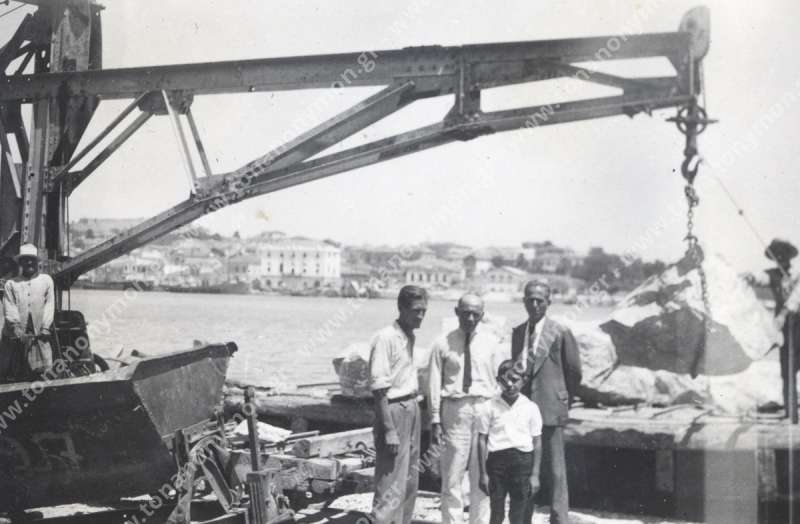 Ενήλικες άνδρες που έχουν μαζί τους και ένα παιδί ποζάρουν κάτω από έναν γερανό, όπως σηκώνει μια μεγάλη πέτρα.