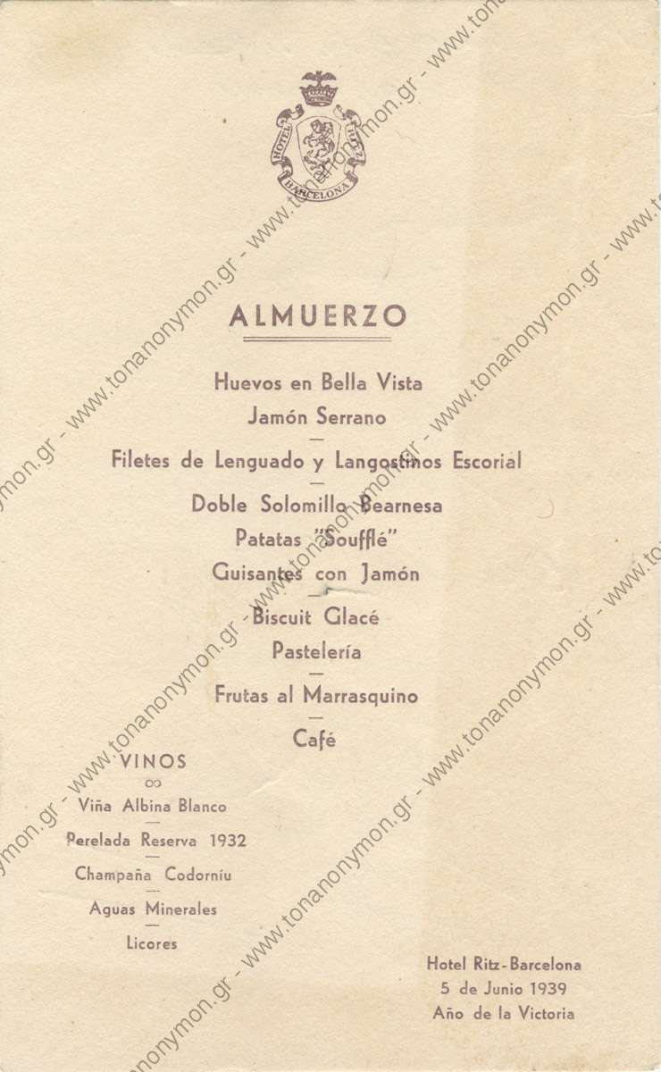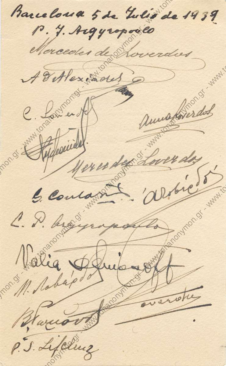 Ντοκουμέντο συνοδευτικό της φωτογραφίας με κωδ. RPH-0014. Κάρτα με το μενού του ξενοδοχείου και στην πίσω όψη τις υπογραφές όσων είχαν παρευρεθεί στη δεξίωση.