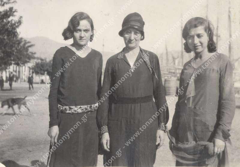 Τρεις γυναίκες κοιτάζουν το φακό. Πίσω τους διακρίνονται αμυδρά κατάρτια από καϊκια.