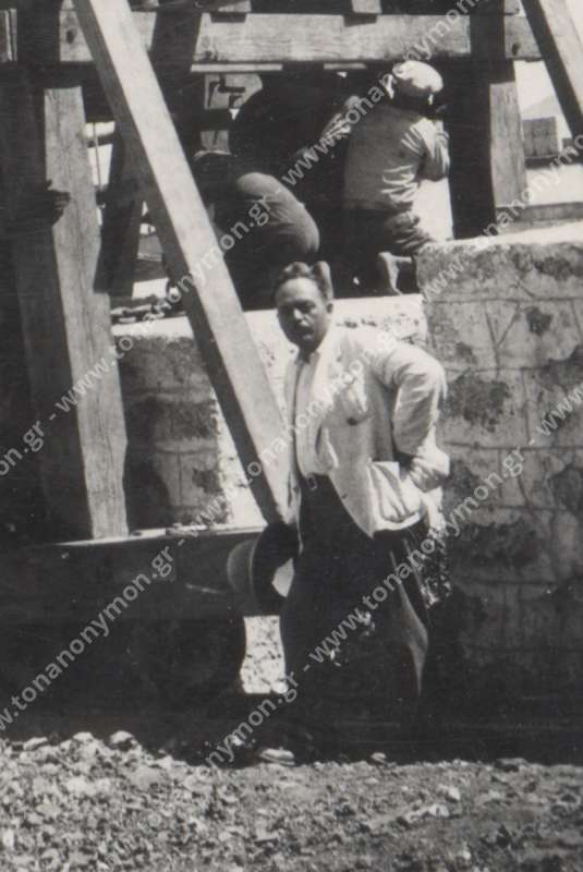 Ένας άνδρας όρθιος στα πόδια του Μεταφορέα, ενώ δυο εργάτες, με γυρισμένη την πλάτη στο φακό, είναι σκυμμένοι κάτω από τη βάση του
