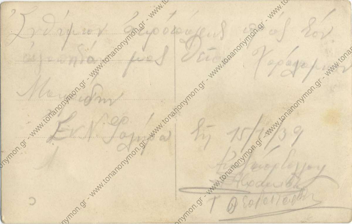 στην πίσω πλευρά αναγράφεται: "Ενθύμιον Ακροπόλεως προς τον αγαπητόν μας θείον Χαράλαμπον Μαυρίδην Εν Ν. Φαλήρω τη 15/10/39 [...] "